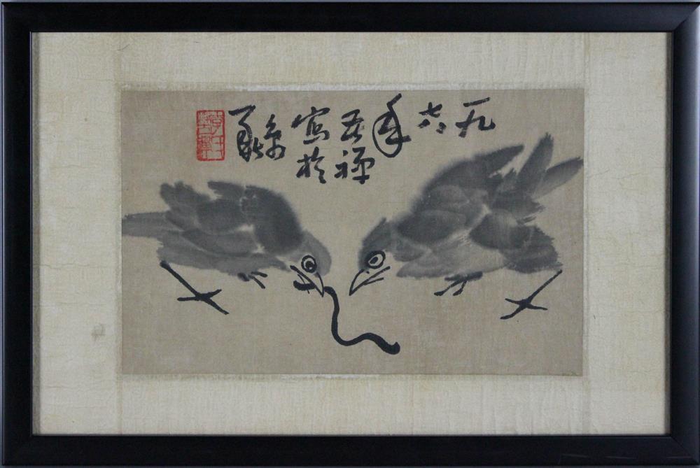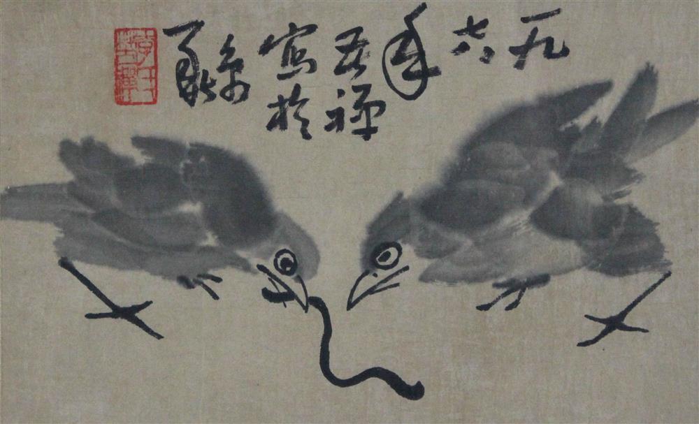 A very representative painting of Li Kuchan 李苦禅. Painted in 1978. 2 birds eating an earthworm. Ex Poly Auction in Beijing. 31 x 19 cm