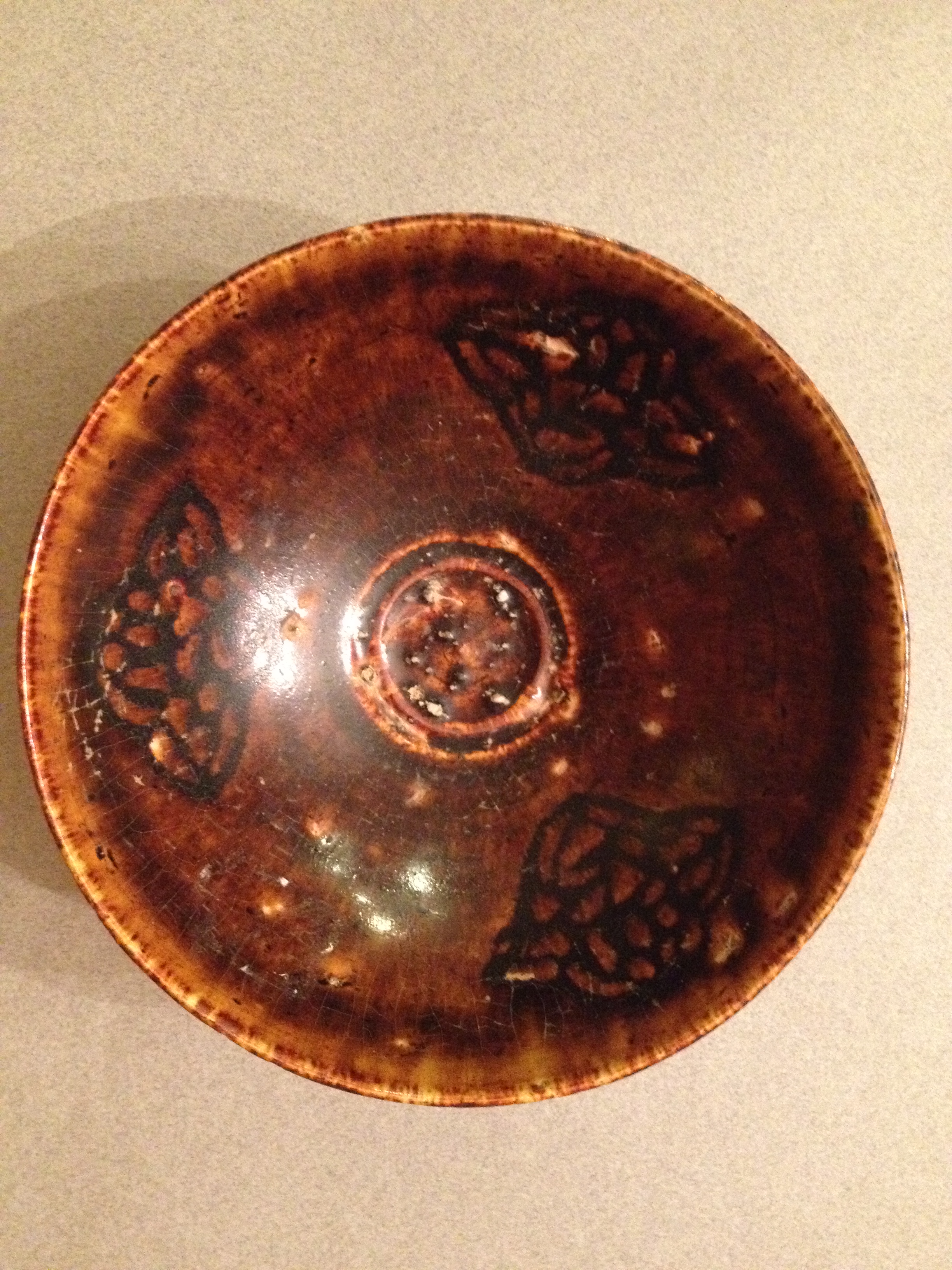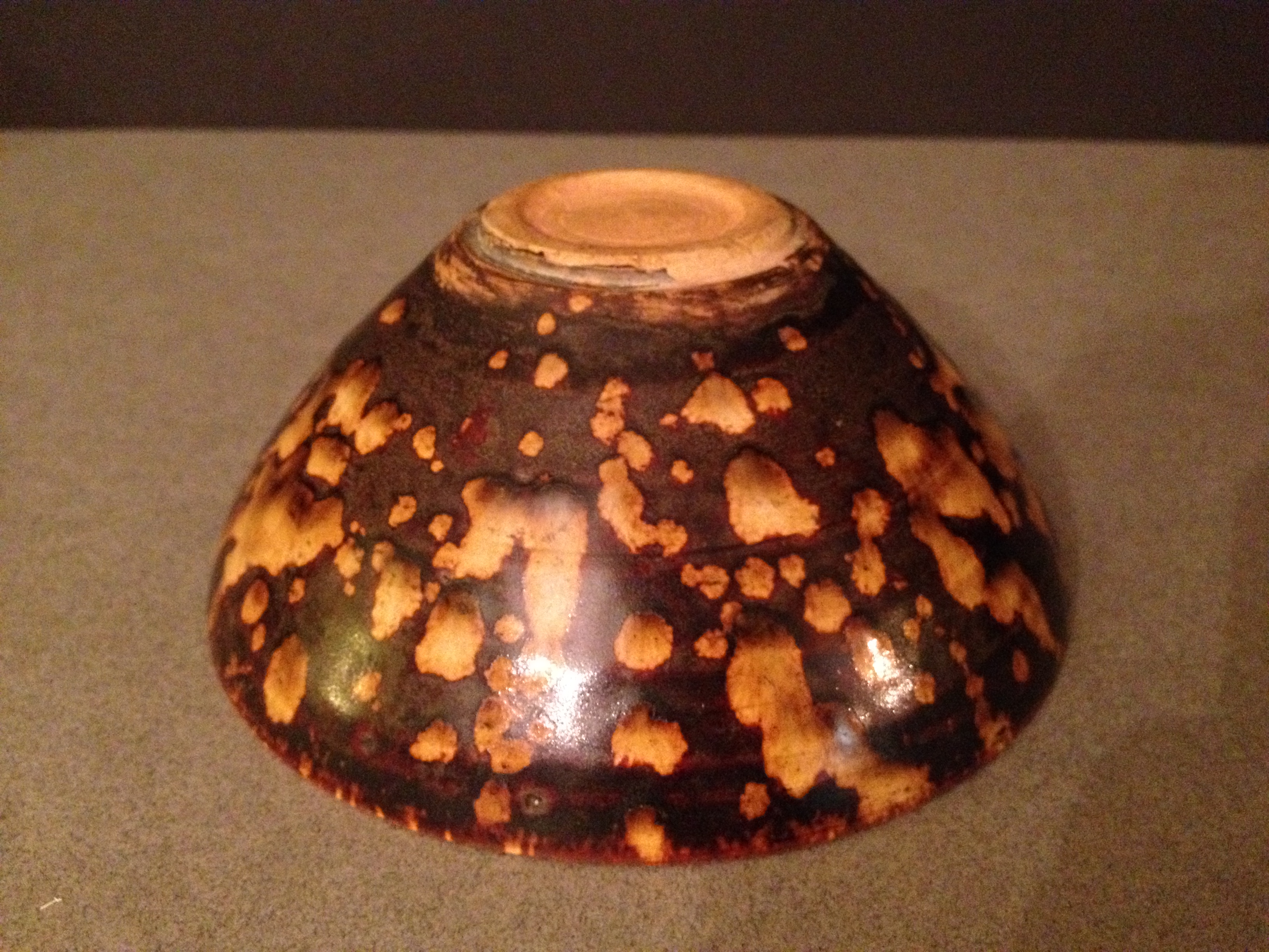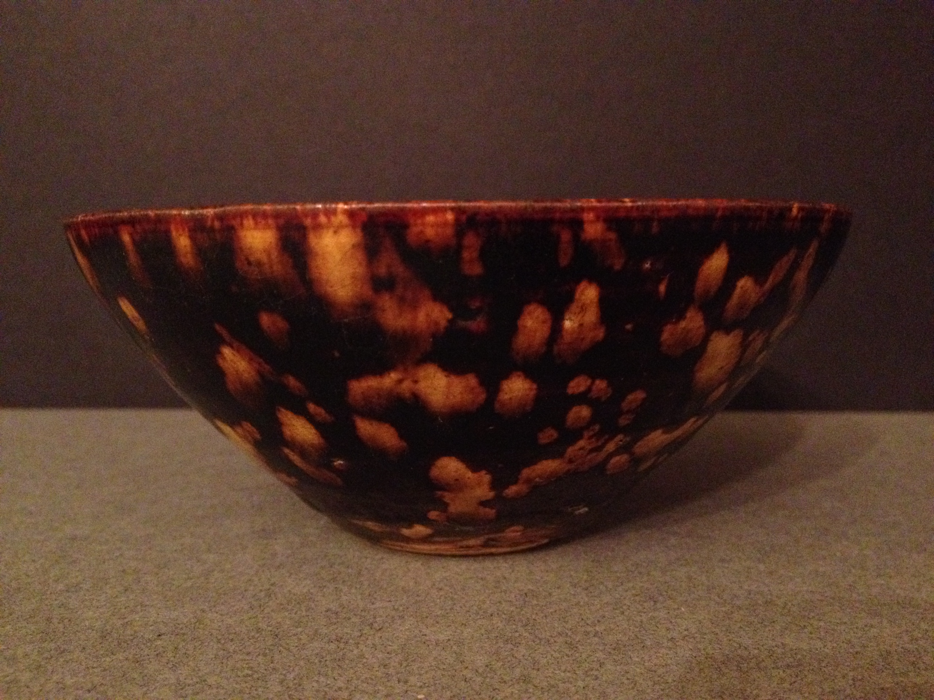 Perfect example of a Southern Song Dynasty Jizhou ware bowl. Paper-cut resist decoration on the inside, tortoise shell glaze on the outside. Perfect condition. 13 cm wide