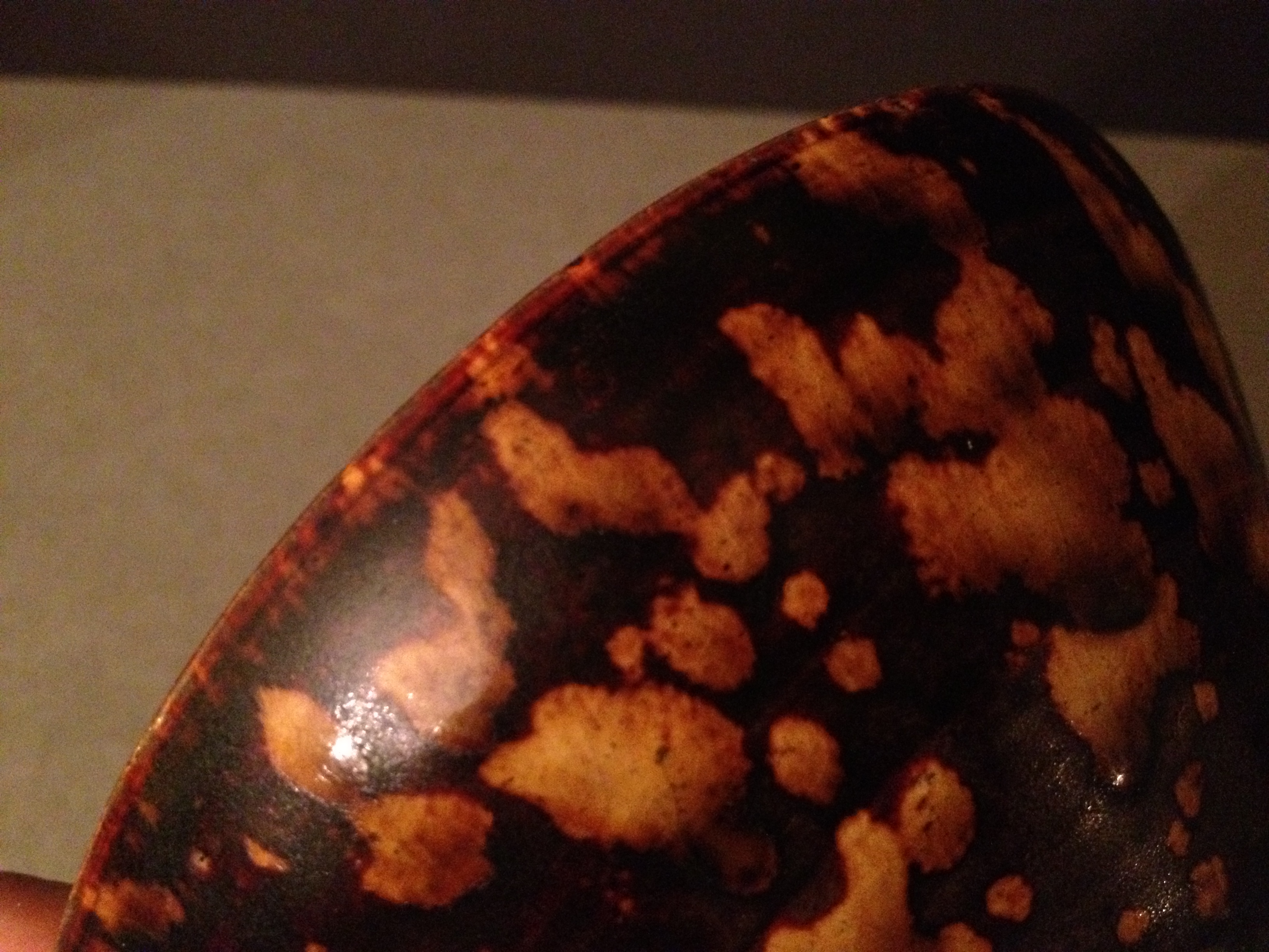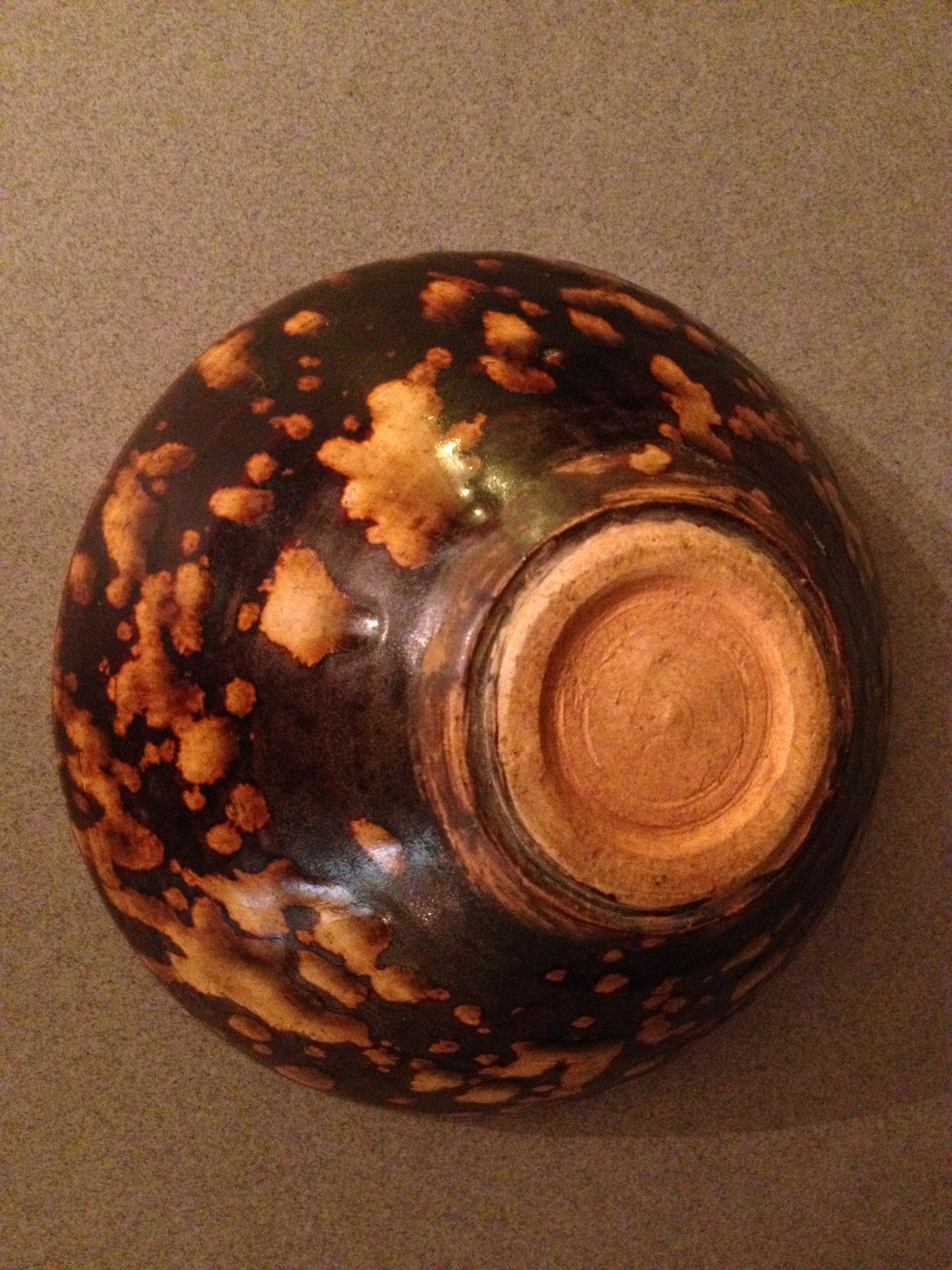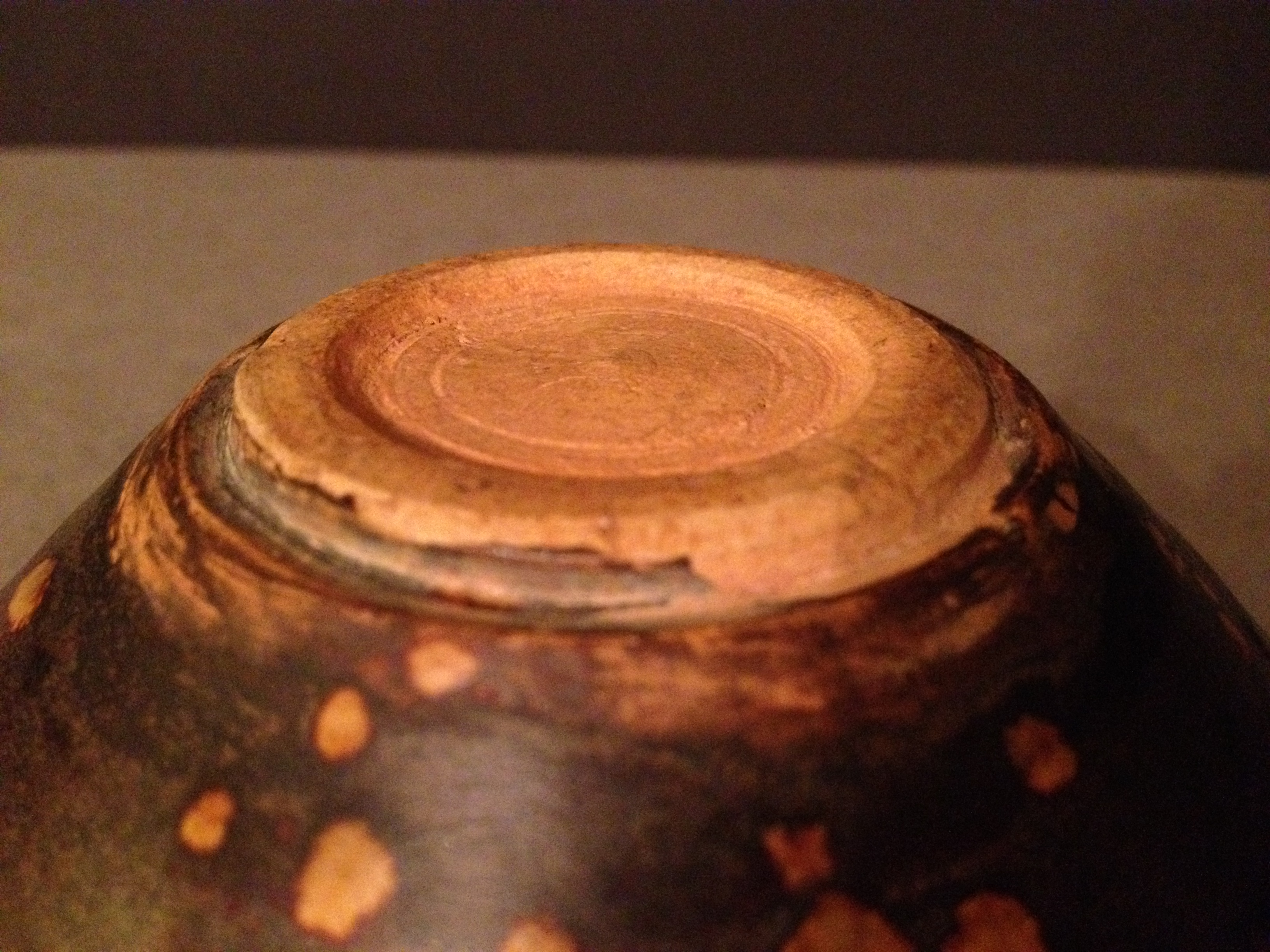 Perfect example of a Southern Song Dynasty Jizhou ware bowl. Paper-cut resist decoration on the inside, tortoise shell glaze on the outside. Perfect condition. 13 cm wide