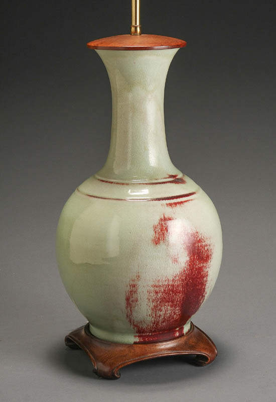 The body with celadon crackle glaze with one side having a running liver-red splash glaze above an unglazed base; now mounted as a lamp, with hardwood cover and footed base. Some glaze imperfections. Height overall: 18-1/4 in (46.4 cm)