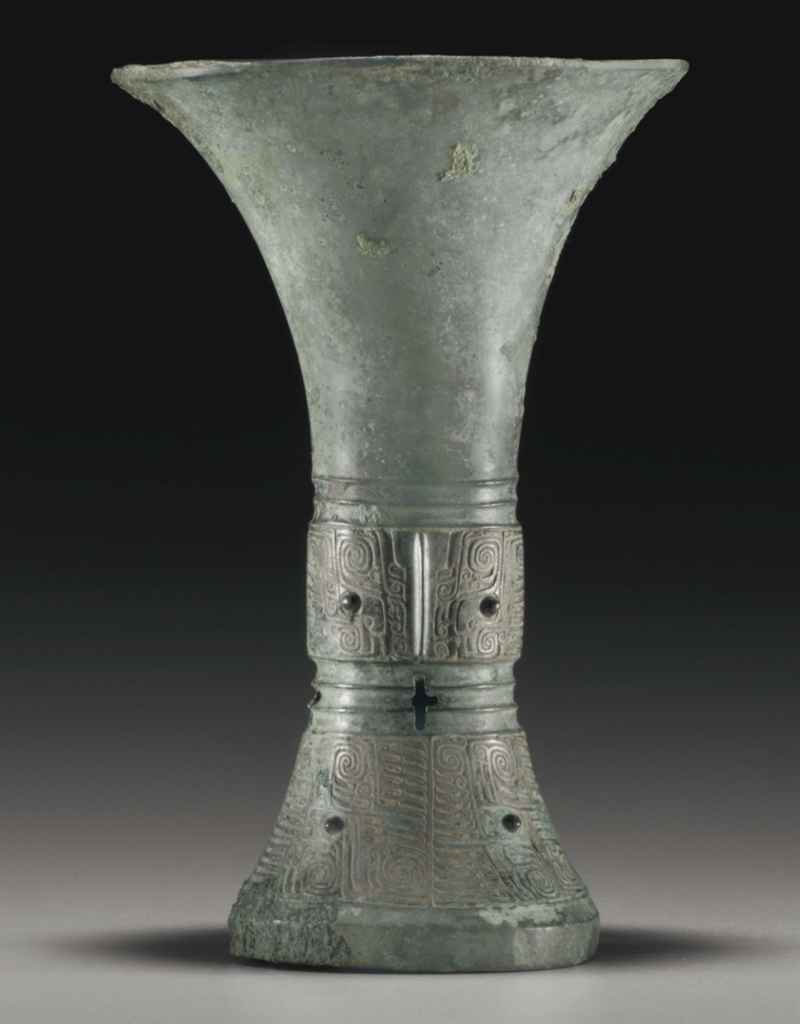 The trumpet-shaped neck is undecorated while the middle section, which is set between double bow-string borders, is flat-cast with taotie masks formed by pairs of downward-facing birds with prominent pupils and quills stacked below the coiled tail. Four birds of similar type, all shown facing in the same direction, fill the quadrants of the band encircling the foot. The bronze has a mottled milky-green patina and some areas of encrustation.
